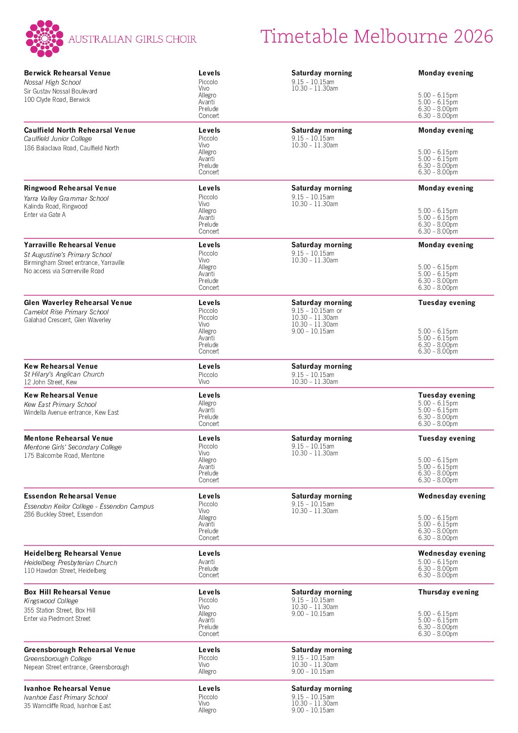 2026 Timetable – Melbourne